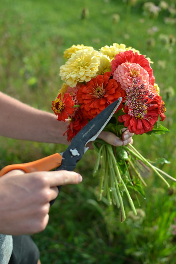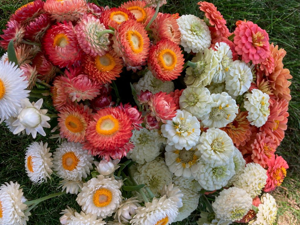 July: Heirloom snapdragons, zinnias, strawflowers, amaranth, yarrow, cosmos, nigella pods
