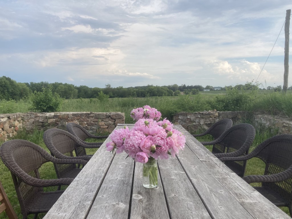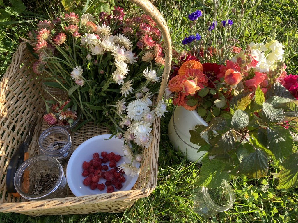 June: Peonies, garden roses, flowering herbs, cosmos, nigella