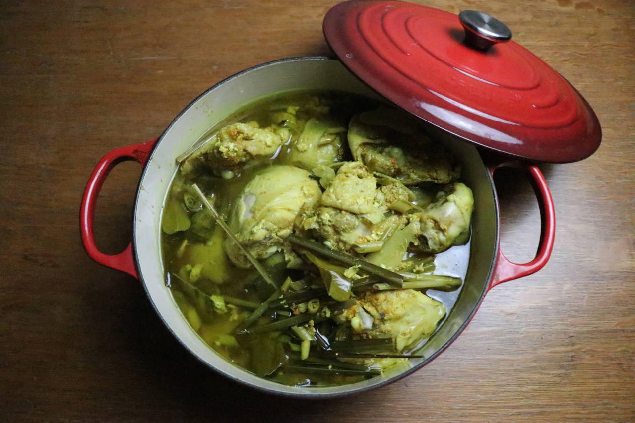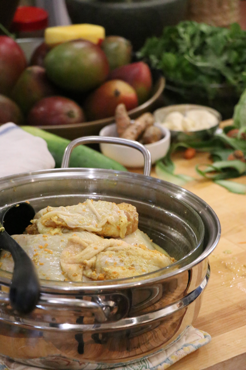 This is unequivocally the most requested dish in our household. It consists of chicken thighs marinated in garlic and lemongrass, which is then steamed with galangal and kafir lime leaf and eaten with a sweet and spicy garlic chili sauce.
