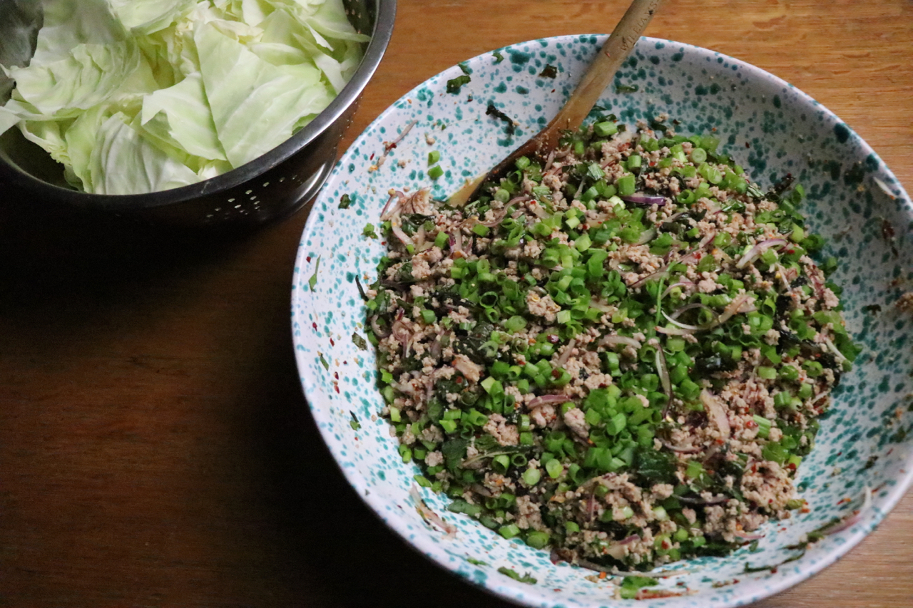 Typically served with sticky rice, larb, a protein based “salad,” is a staple of Issan street food that consists of minced pork tossed in toasted rice powder, fish sauce, fresh chilies, lime, scallions, green onions, and mint.
