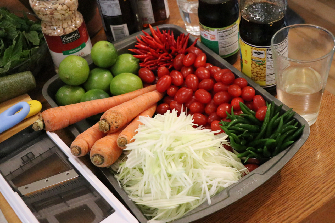 If there is a single dish that most represents the street food culture of Issan, it is likely Som Tum. While the traditional regional version of the dish is called Som Tum Lao, most westerners have a difficult time with its main seasoning ingredient, Pra La, a fermented fish/paste. Thus, we’ll be focusing instead on the more foreign friendly version, Som Tum Thai, a fresh salad made from shredded green papaya, tomatoes, lime, sugar, fish sauce, and peanuts.